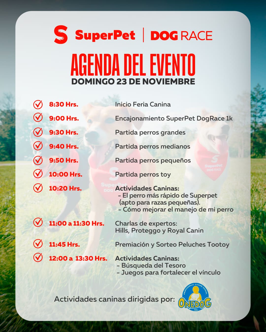 Este 23 de noviembre, ven a disfrutar de una carrera lúdica donde tú y tu perro serán el mejor equipo. Además, ¡disfrutarán de una gran feria canina con muchas sorpresas y actividades!